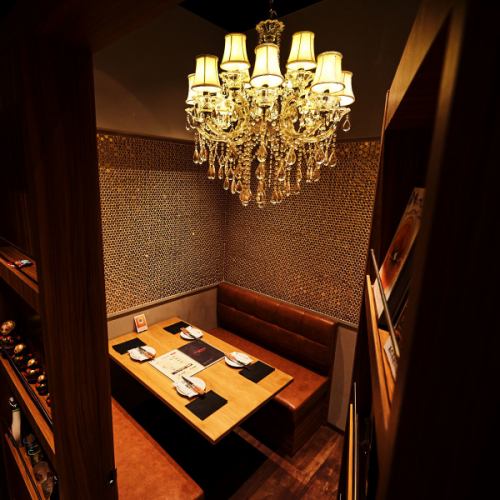 お店を象徴するカウンター席を通り抜けると、古民家をモダンにアップデートさせたような趣のある空間が広がります。さらに奥へ進むと男心をくすぐるギミック付きのドア付き完全個室が・・・!開けると煌びやかに輝くシャンデリア♪2名~4名様の少人数でご利用いただけます。