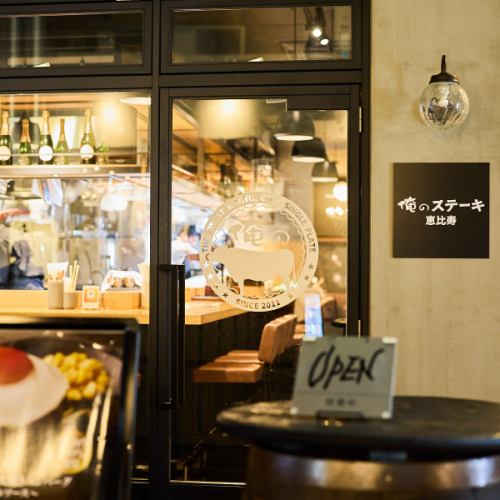 恵比寿駅すぐにある交差点すぐにある裏路地に佇む「俺のステーキ恵比寿」。道路から見えるのは開放的なオープンキッチンに対面するカウンター席。その奥へ歩みを進めると、古民家をモダンにアップデートしたような隠れ家雰囲気のある趣きある空間が広がります。秘密基地のような完全個室は男心をくすぐるギミックが・・・。
