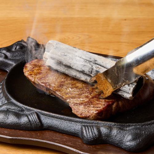 当店のステーキは温度管理を重視するため、あえて鉄板でミディアムレアに焼き上げて提供しております。そこからさらにお客様の目の前で「炭焼き」を実践!黒毛和牛ステーキに高温の炭を当てることで醤油の香ばしさと炭火ならではの香りがより一層食欲を刺激してくれます。パフォーマンスも含めてお楽しみくださいませ♪